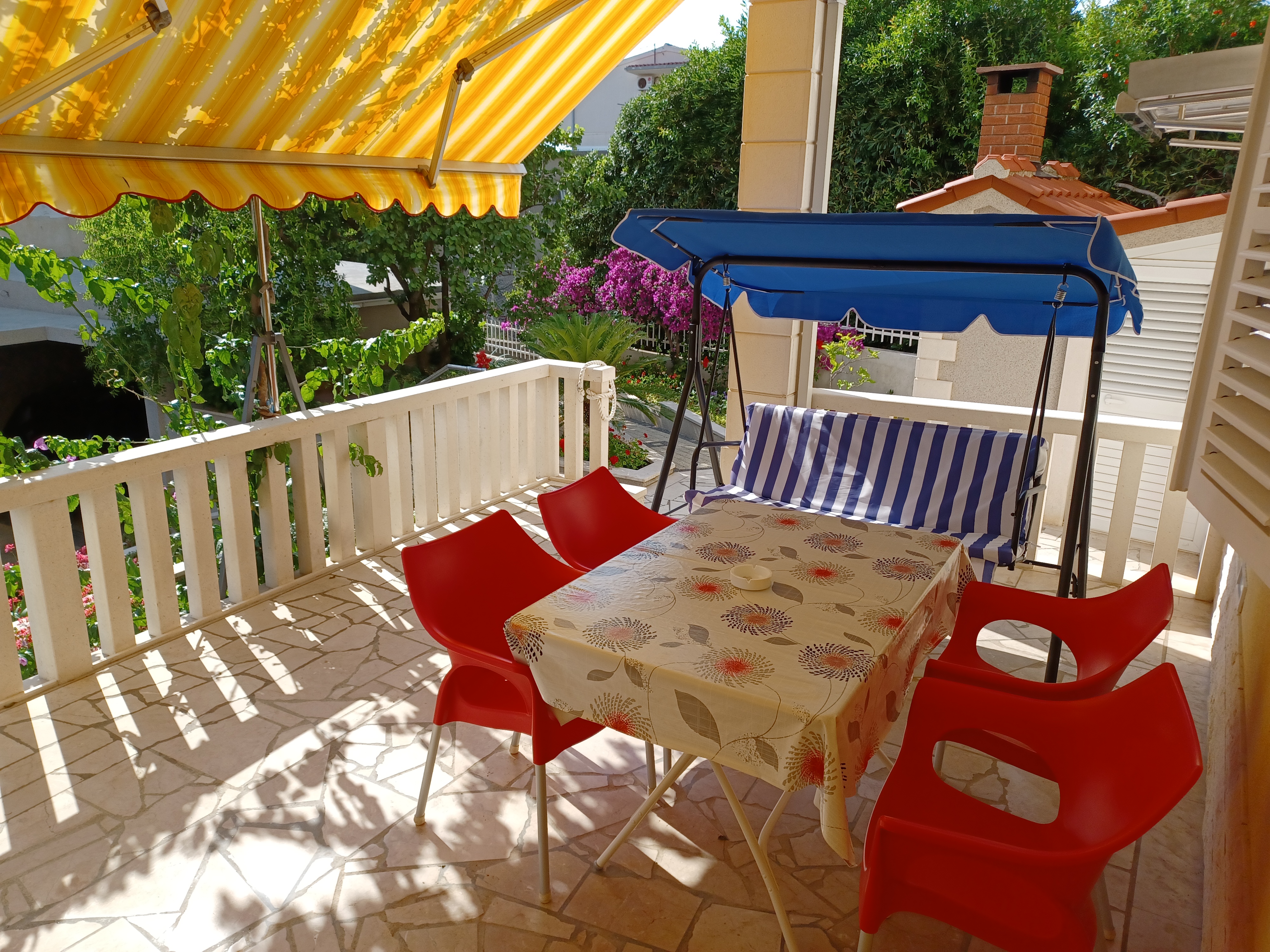The apartment has a large terrace overlooking the garden with a beautiful flowers and mediterranean plants .