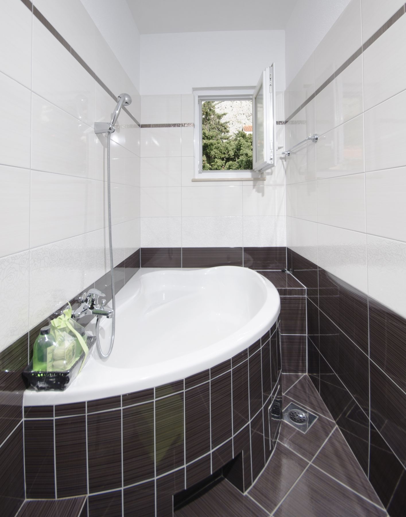 The large bathroom is equipped with a bathtub , while the smaller bathroom is equipped with shower .