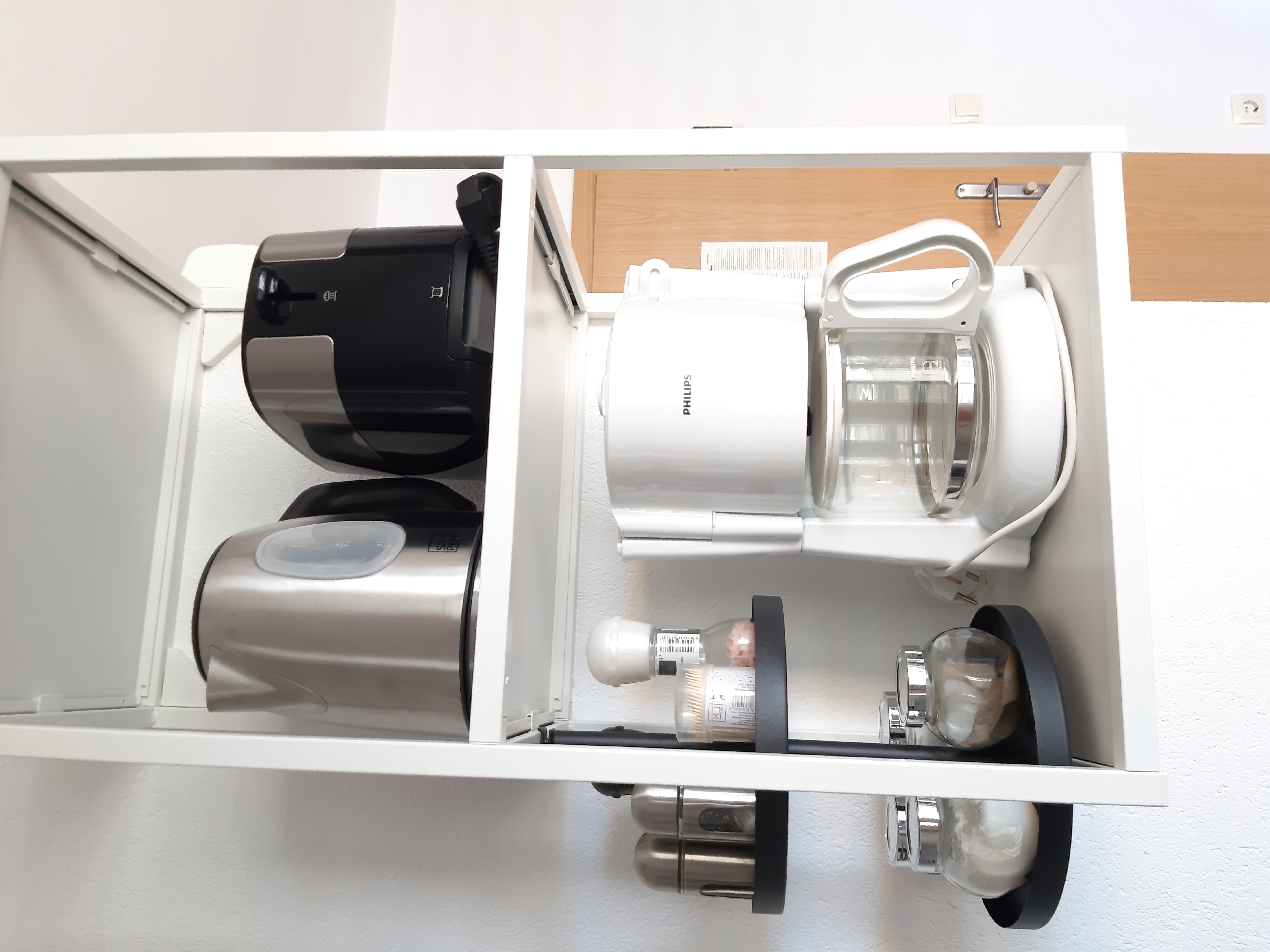 The kitchen has a microwave, coffee machine, toster, fridge and all necessary dishes.