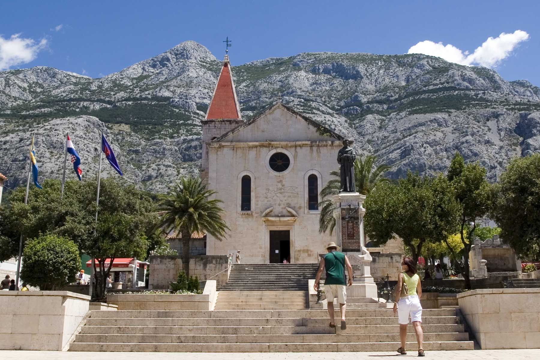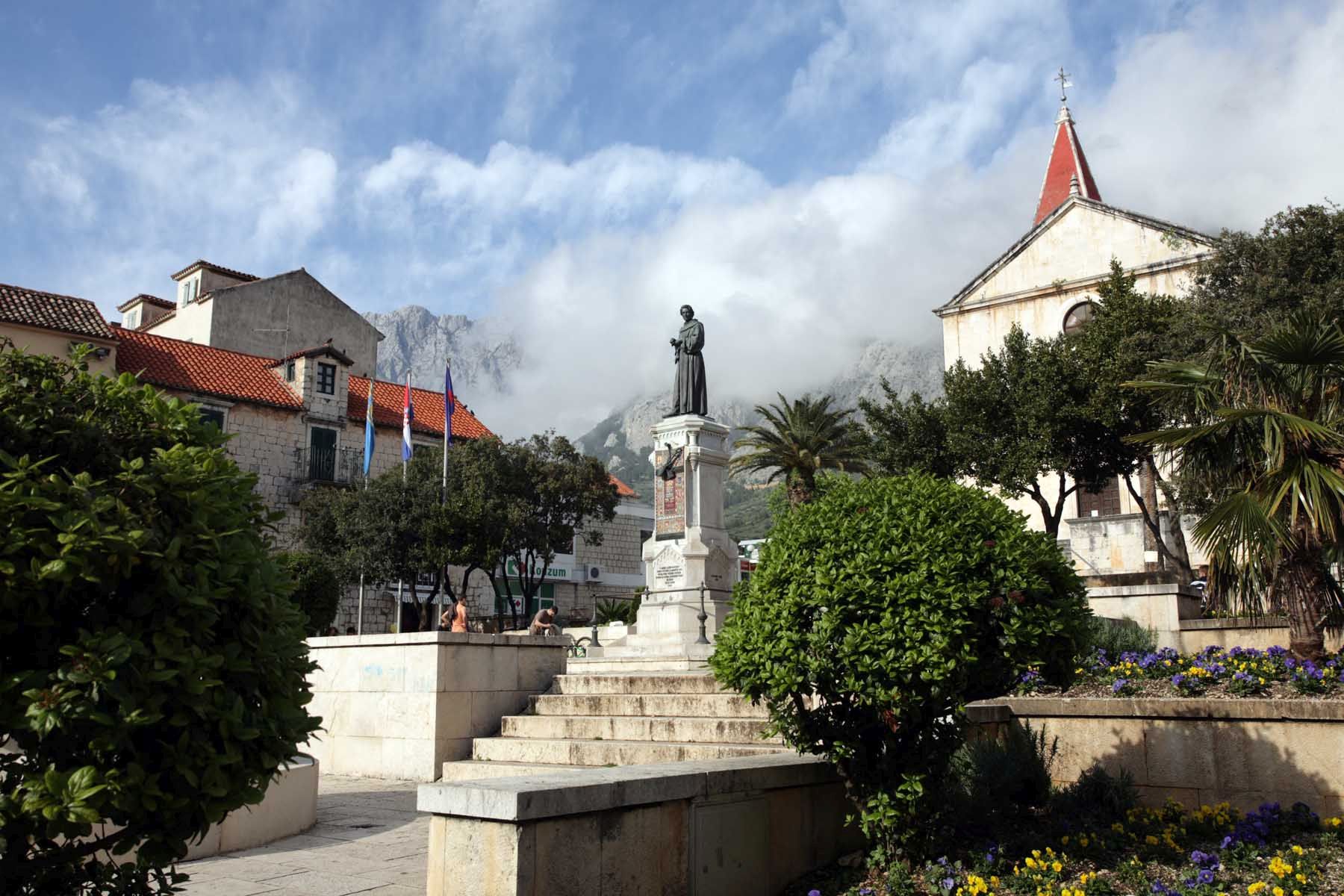 Despite two hundred years of Turkish occupation, little of Ottoman vintage survives, and the Venetian and Habsburg era buildings on the seafront Riva coexist with modem apartment blocks thrown up after the lounsm boom. All that survives of the old town is one central square, Kačićev trg, which slants up just behind the waterfront to the Baroque St. Mark's Church (Crkva sveti Marko). Outside is Ivan Rendić's statue of Andrija Kačić-Miošić (1704-1760). The Franciscan friar whose Razgovor ugodni naroda slavinskog“ ("A Pleasant Conversation of the Slav People") was the most widely read book in the Croatian language until the twentieth century, after which its archaic stvle fell out of fashion.